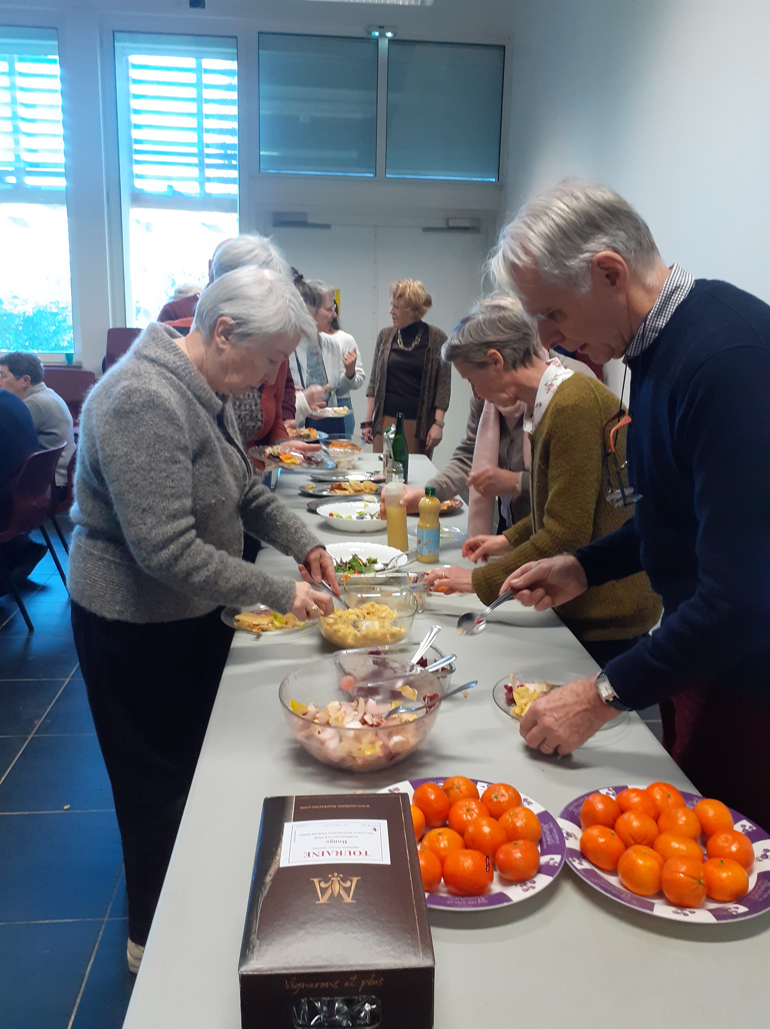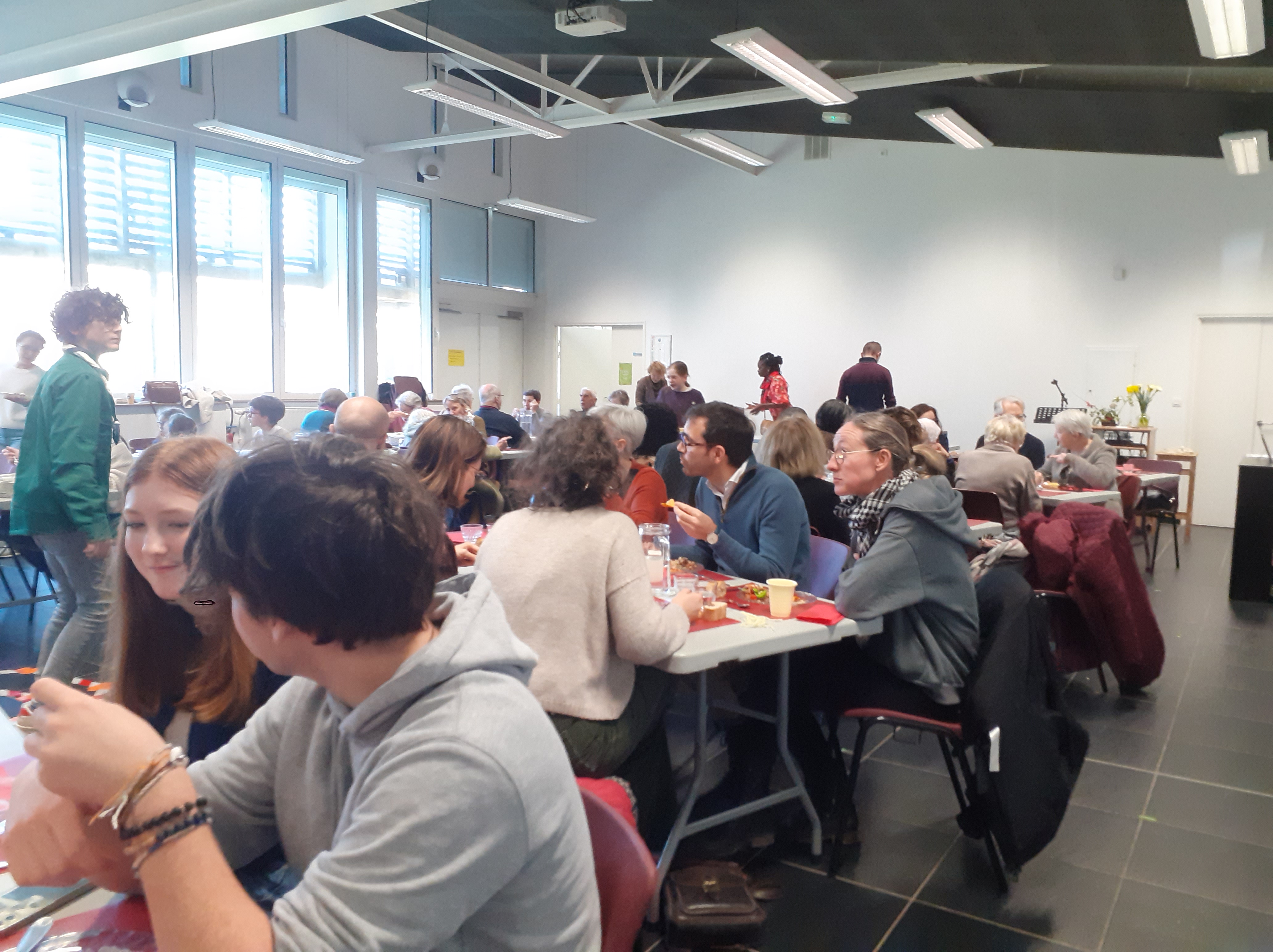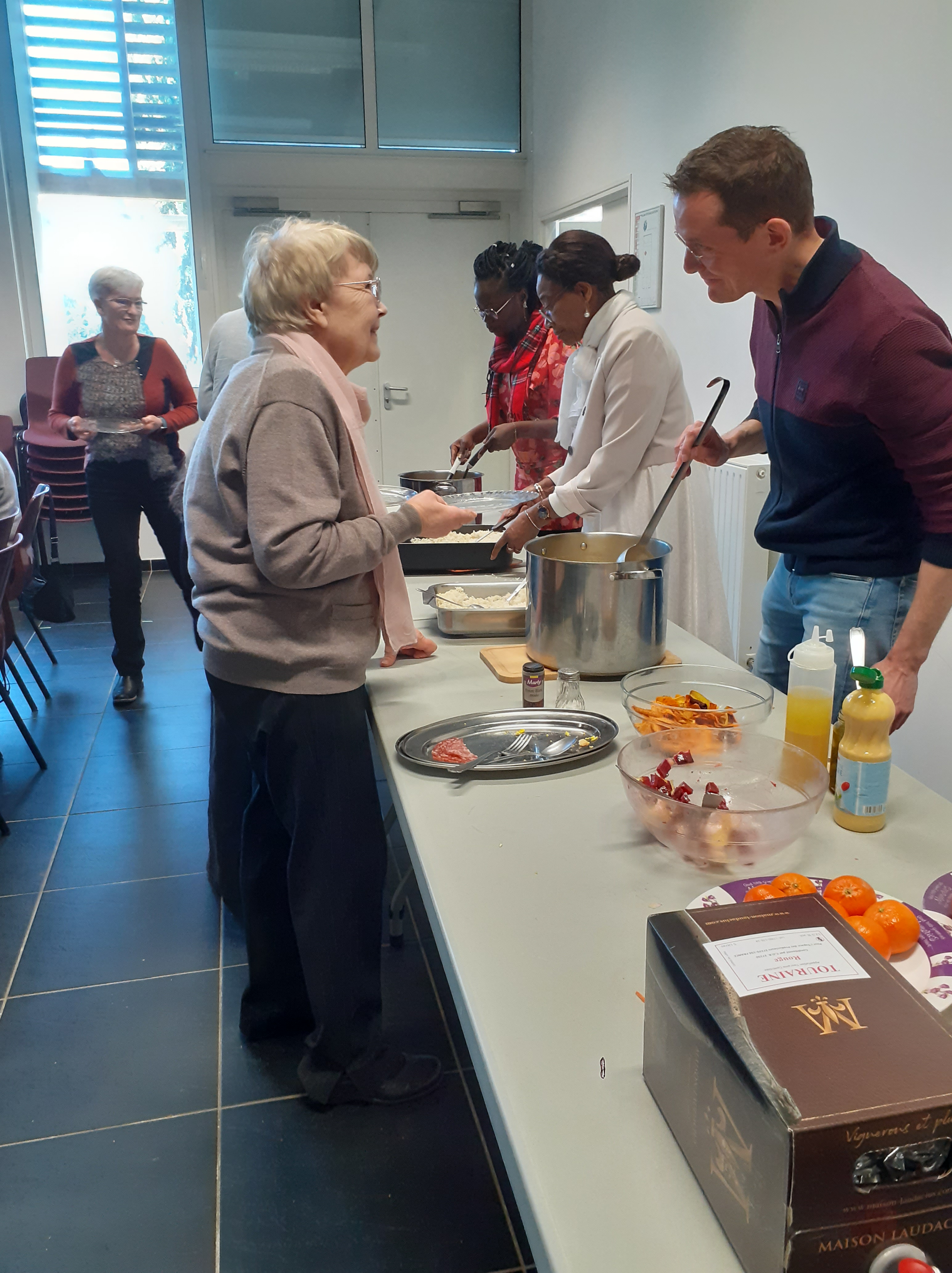 Un soleil généreux éclairait la cour du centre paroissial ce dimanche 2 mars, et la journée promettait d’être belle. Le matin même, dès 9h, les membres du conseil d’administration de Rencontre-Entraide s’affairaient dans la cuisine, déposant des gâteaux, des salades, rectifiant l’assaisonnement du poulet à la crème, disposant le riz cuit dans un plat allant au four. L’apéritif était déjà préparé, et les petits feuilletés, pizzas, cakes etc. seront juste réchauffés quelques instants, après le culte.