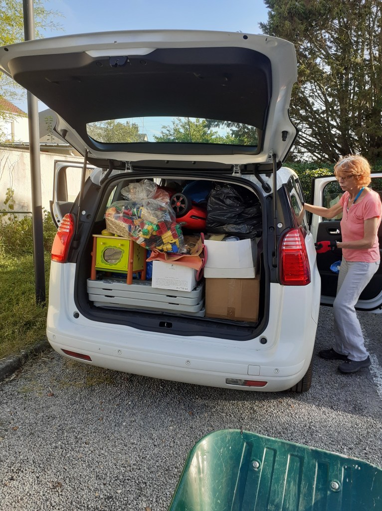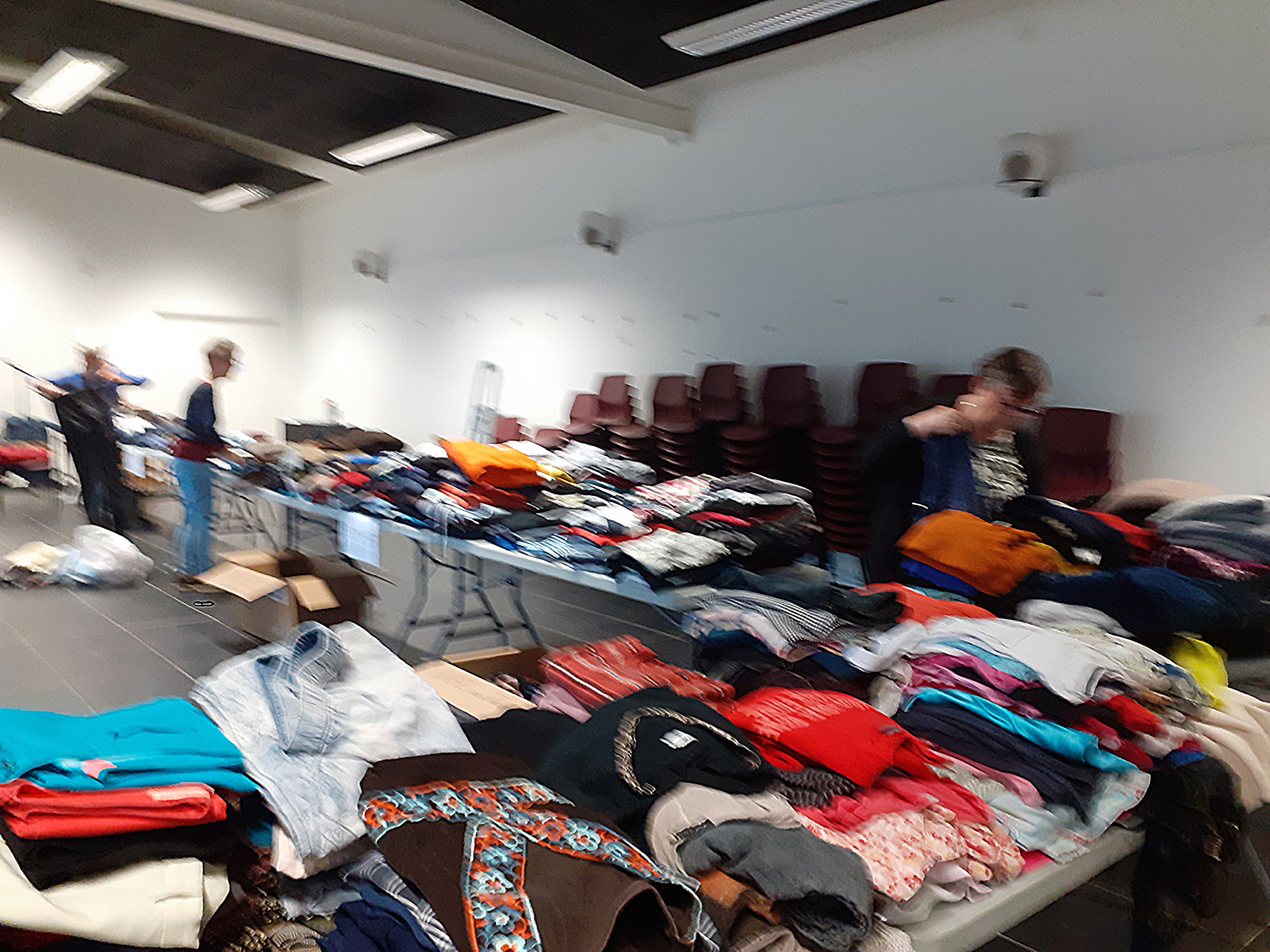 Toute la journée, 18 bénévoles se sont relayés pour tenir les stands, renseigner les clients, et vendre livres, vêtements et chaussures, petit outillage, tapis ou autres objets décoratifs. Vers 18h tout ce qui restait a été à nouveau chargé dans les voitures puis transporté au centre paroissial pour être à nouveau trié en fonction de la destination des objets : stockage pour une prochaine friperie ou brocante, Emmaüs ou Relais. Ceci nécessitera encore quelques trajets la semaine prochaine